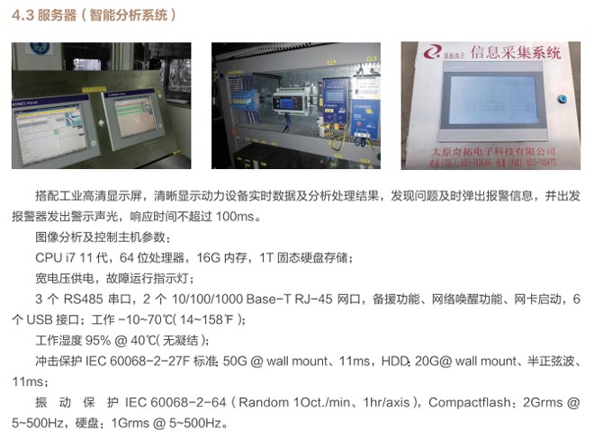 動力設(shè)備集群智能在線監(jiān)測管理系統(tǒng)用于對采集的信號進(jìn)行實時分析,包括設(shè)置監(jiān)測任務(wù),根據(jù)采集模塊提供的信息,進(jìn)行數(shù)據(jù)分析、識別故障狀態(tài)、提供報警信號、存儲歷史數(shù)據(jù)、提供內(nèi)外部通訊接口。狀態(tài)分析模塊提供設(shè)備狀態(tài)、連接狀態(tài)、報警狀態(tài)等,具有設(shè)備復(fù)位、自學(xué)習(xí),便于現(xiàn)場人員操作設(shè)備,識別設(shè)備狀態(tài)。故障信號可通過以太網(wǎng)、工業(yè)現(xiàn)場總線等方式輸出至生產(chǎn)線控制系統(tǒng)或集中控制系統(tǒng),為運(yùn)行人員提供清晰的故障狀態(tài)指示。同時,狀態(tài)分析設(shè)備需支持 MQTT、OPC-UA 等工業(yè)物聯(lián)網(wǎng)通訊協(xié)議,以滿足云端數(shù)據(jù)分析和遠(yuǎn)程專家服務(wù)的需求。